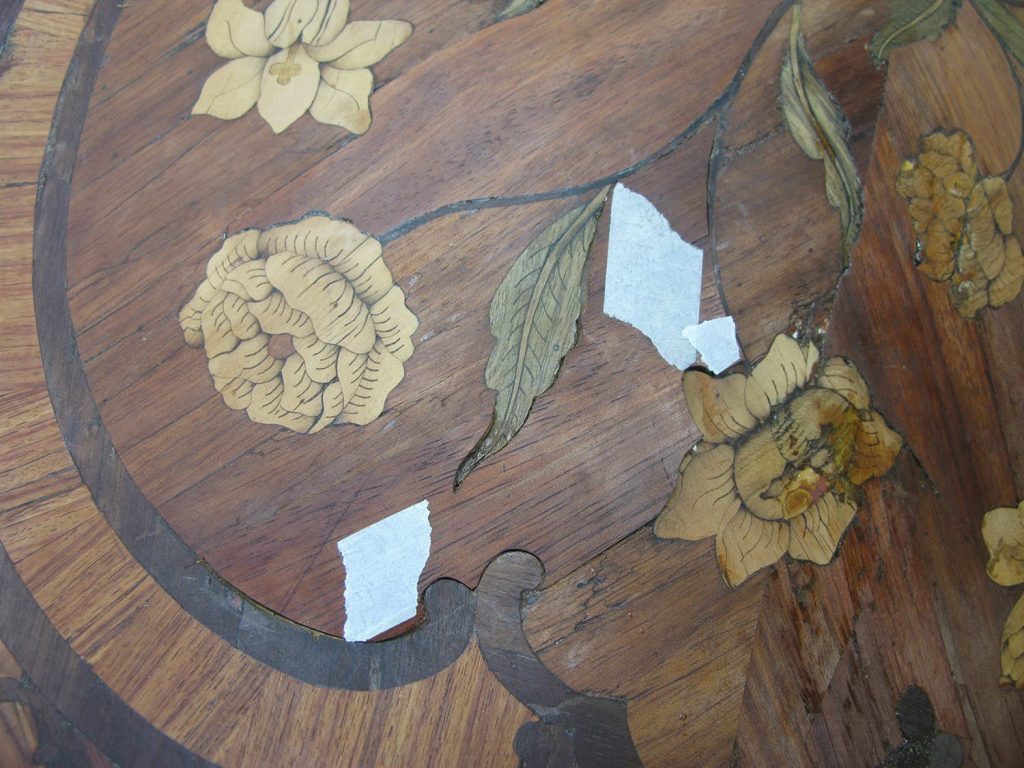 La sélection des matériaux pour l’excellence des incrustations fait l’objet d’une attention particulière dans notre atelier, où chaque essence est choisie pour ses qualités exceptionnelles et sa rareté. Notre réserve de bois précieux, maintenue dans des conditions hygrométriques strictement contrôlées, abrite les essences les plus nobles et les plus rares du monde. Pour la restauration du Buffet Zwiener, véritable chef-d’œuvre d’ébénisterie du XIXe siècle, nous avons sélectionné des placages d’une qualité extraordinaire, choisis non seulement pour leur veinage remarquable mais aussi pour leur parfaite complémentarité avec l’excellence des incrustations d’origine. Chaque plateau, chaque bille de bois précieux est évaluée sous un éclairage spécifique qui révèle la richesse de ses veines et la profondeur de ses teintes. Cette sélection rigoureuse peut prendre plusieurs jours, car il s’agit non seulement de choisir les plus beaux spécimens, mais aussi de s’assurer de leur parfaite harmonie avec l’ensemble de la pièce.