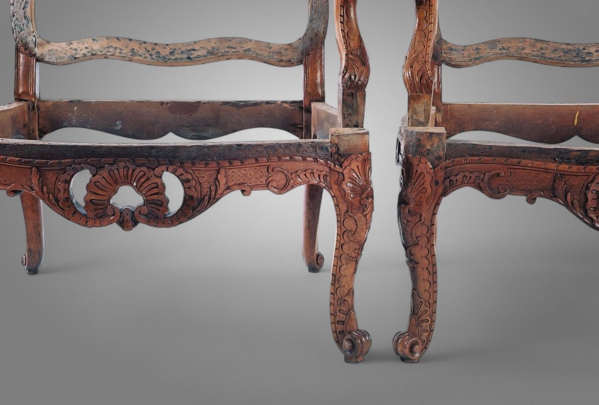 Lorsqu’un siège arrive à l’Atelier Marcu, on procède la plus part du temps à un démontage total ou partiel afin derestaurer les assemblages fracturés. Le siège est ensuite remonté cheviller à « tire » ou collé selon l’époque de celui-ci.