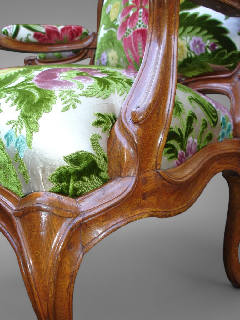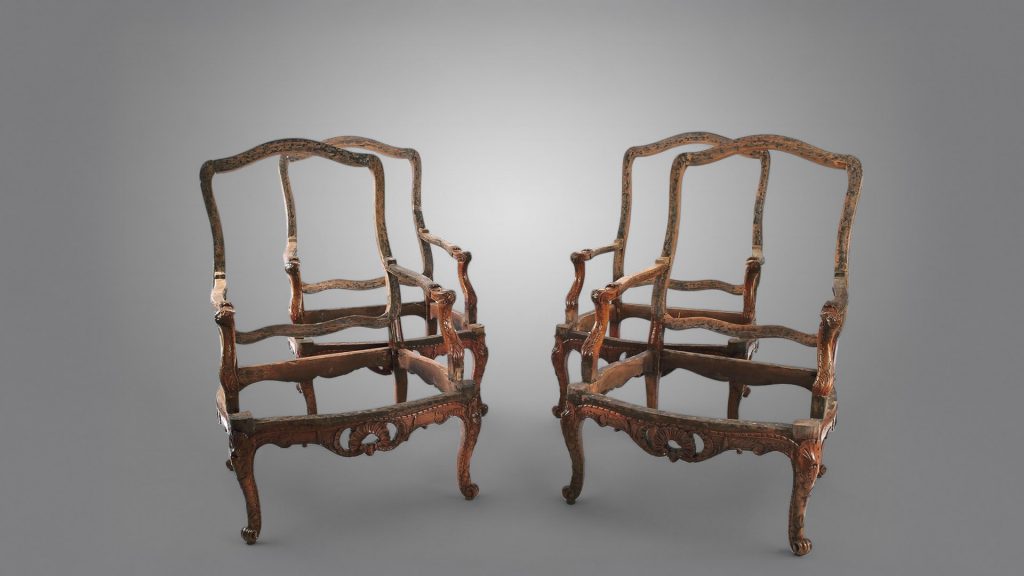 Les sièges en bois doré ou laqué font tout d’abords l’objet d’un fixage afin de conserver au maximum les éclats de dorure ou peinture. Les bois sont ensuite démontés si nécessaire et restaurés, puis cette fois repris en dorure de façon plus approfondie.